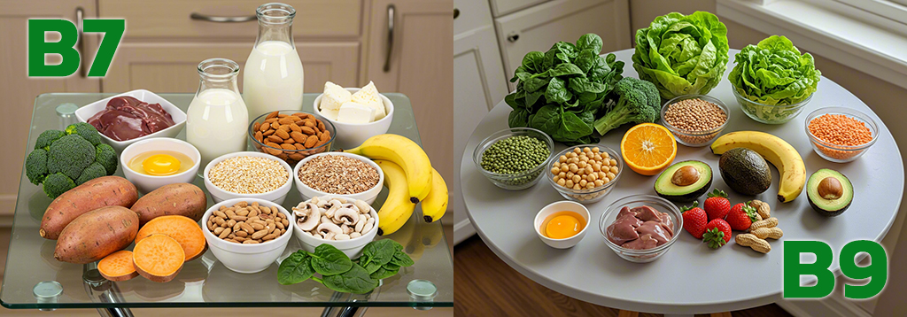 A biotin számos ételben jelen van, de kisebb mennyiségben. Főbb forrásai a tojássárgája, máj, húsok, tej és tejtermékek, diófélék (mandula, mogyoró), magvak, teljes kiőrlésű gabonák, hüvelyesek, édesburgonya, spenót, gomba, banán.