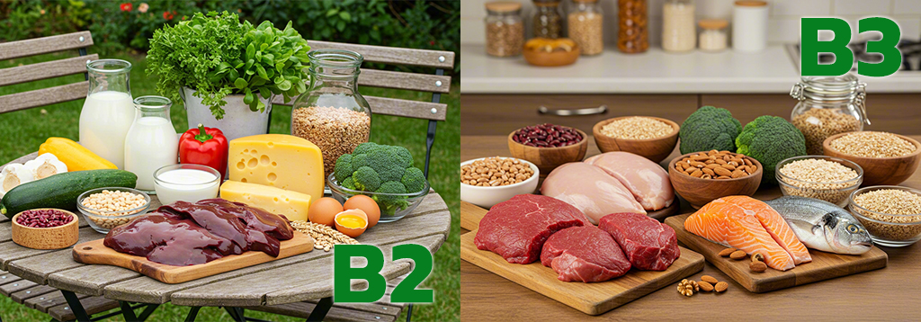 A riboflavin természetes forrásai közé tartoznak a tej és tejtermékek, húsok (különösen a máj), a tojássárgája, a teljes kiőrlésű gabonák, zöldségek (spenót, brokkoli, kelkáposzta, zöldborsó), valamint a diófélék és magvak: mandula, napraforgómag.